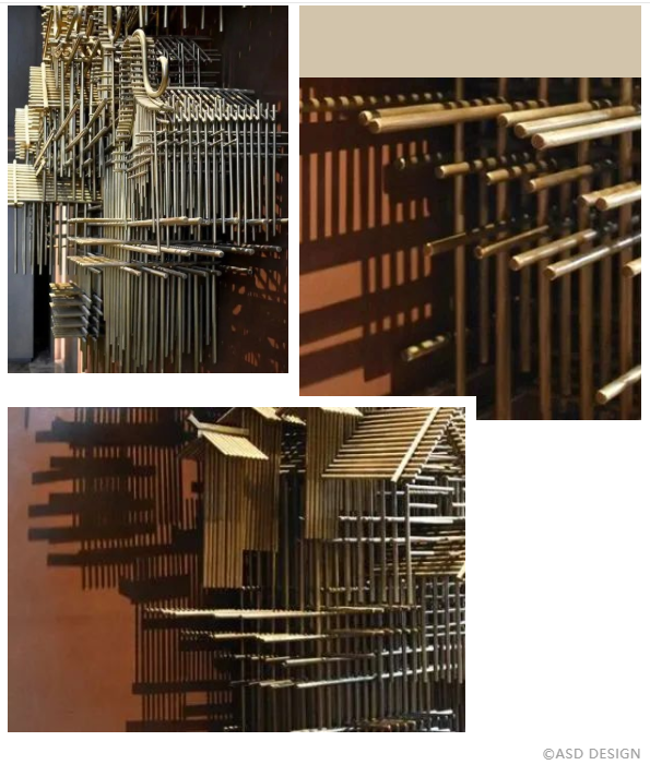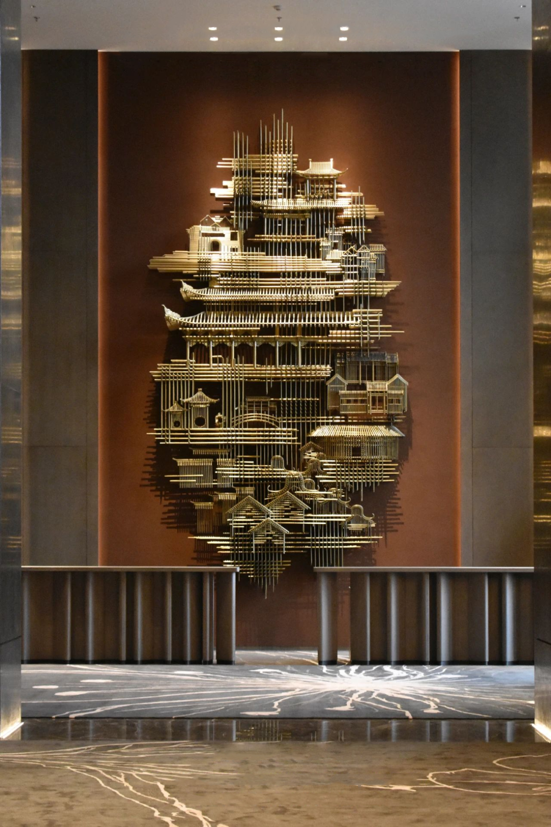 大堂背景雕塑“城韻”,取中國八大建筑派系精華集成,將傳統(tǒng)的古建筑元素以現(xiàn)代藝術(shù)手法進行重組,高高低低,錯落有致,講述著追夢人在此共同筑夢、追夢,搭建出城市的壯闊版圖。