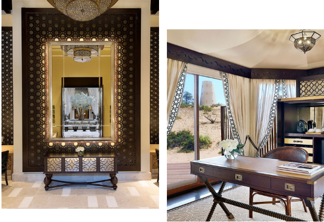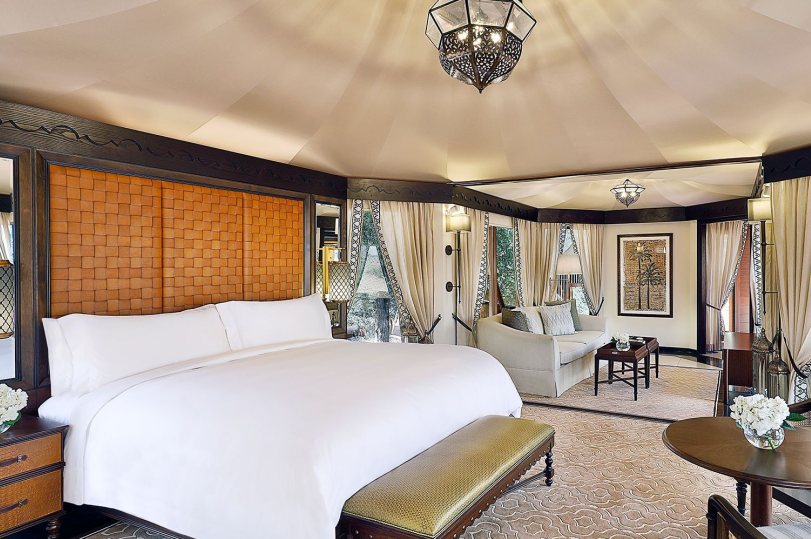 酒店設(shè)計將傳統(tǒng)貝都因游牧民居風(fēng)格的帳篷屋頂與經(jīng)典阿拉伯風(fēng)格的別墅家具進行了現(xiàn)代詮釋,度假村無縫地融入沙漠環(huán)境。