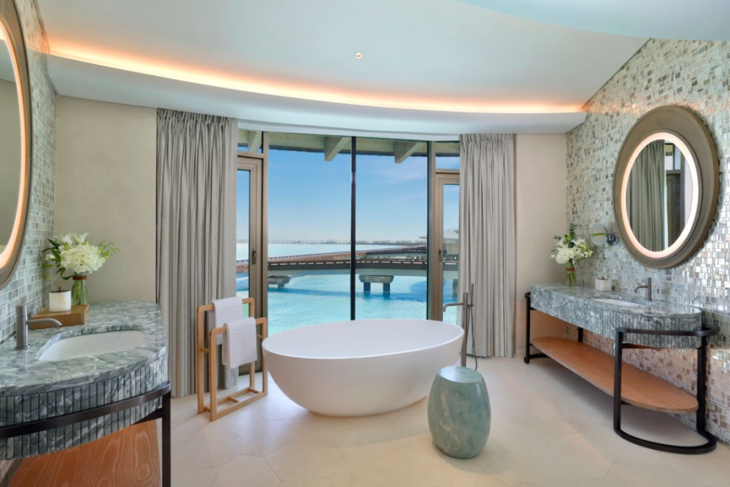 所有的獨棟別墅都配有私人游泳池和落地窗,阿拉伯灣的水域、奇幻沙漠景觀、壯麗的山脈一覽無遺,營造出一種超現(xiàn)實的沙漠浪漫氛圍。